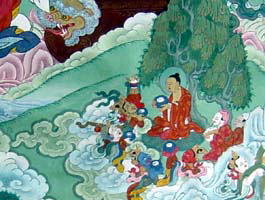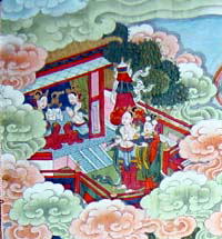 兜率天(とそつてん)にいた釈尊の前世の善恵菩薩は、自分の後任に弥勒菩薩を決めて、下界に降り立つに相応しい場所として、カピラ城浄飯王の家に降りてくる。