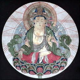さらに、求聞持法(ぐもんじほう)の本尊(上図)である。満月の中に金色身で蓮華上に半跏座(画像では結跏趺座が多い)して、面相は殊妙で喜悦相、宝冠上に五仏が結跏趺座している。左手は瑠璃色で黄色の光焔を放つ如意宝珠のある薄紅色の蓮華を持つ。右手は右膝の上で掌を外に向け五指を垂らした与願の印を結ぶ。月輪中に頭光身光を三本ずつの筋光として描くのを特色とする。求聞持法とは、詳しくは「虚空蔵菩薩能満諸願最勝心陀羅尼求聞持法」と云う。虚空蔵菩薩を本尊として心身を清く保ち、如法に真言を百萬遍誦することにより、一切の経文を暗記し理解することができ、宇宙に遍満する仏の智恵を一身に体得することができるとする秘法である。ここでは宇宙生命そのものを虚空蔵菩薩と観る。弘法大師が京の大学をやめて、唐(中国)に渡るまでの間の仏道修行時代に幾度となく修法された。この修法により大師は宇宙の大生命に触れられ、このことが後の真言宗の教義を展開する基礎となる。なお、求聞持法には如意輪観音を本尊として修する如意輪求聞持法もあるが、普通に求聞持法と云うと虚空蔵菩薩求聞持法を指す。