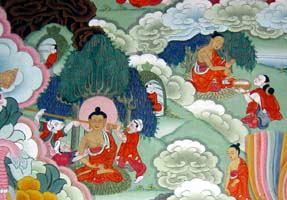 そこで先ず最初に、修行時代の恩師達にと思いたつも、ア-ラ-ダ師は一週間前に、ウドラカ師は前日お亡くなりになっていた。そこでかつての修行仲間五人に初めて法を説くことにして、バラナシの郊外ムリガダーヴァ(鹿野苑)に向かわれた。