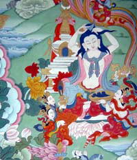 兜率天(とそつてん)にいた釈尊の前世の善恵菩薩は、自分の後任に弥勒菩薩を決めて、下界に降り立つに相応しい場所として、カピラ城浄飯王の家に降りてくる。